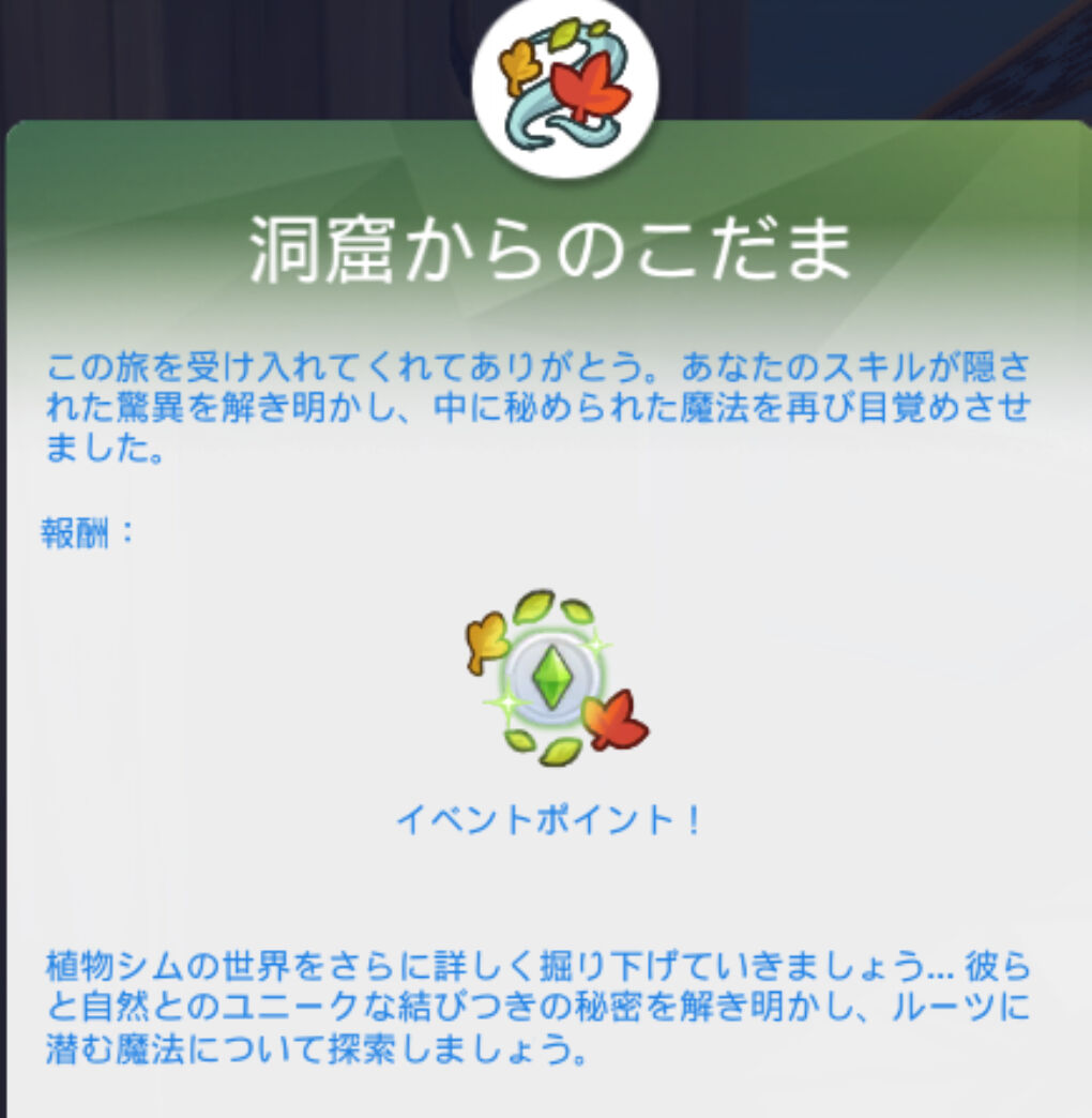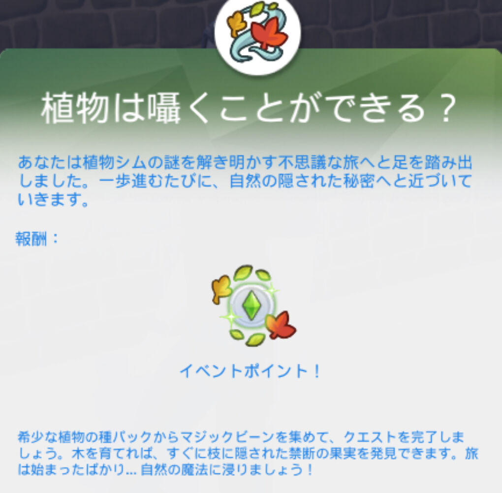 新パックで妖精と植物シムの関連性が高いということで、改めて植物シムのすごさや楽しさをプレゼンするためのストーリーなのかな?さあ、ここから君が秘密を解きあかす番だよ!っていう誘導は悪くはないかもしれないですね。まあちょっとかなり強引ではありますがw
