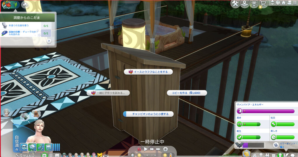 持ち運びできるのでは?!って結構期待してたのでちょっとガッカリしちゃいました…。まあ、区画一つにつき一つは必ず公衆トイレがあるものですが…普通のシムちゃんだと公衆トイレ汚がってイヤがっちゃうから、持ち運びできると助かったのになあ~~…まあ、このクソデカ木造トイレがポータブルっていうのもちょっと無理があるかもしれませんし…wしょうがないですねw