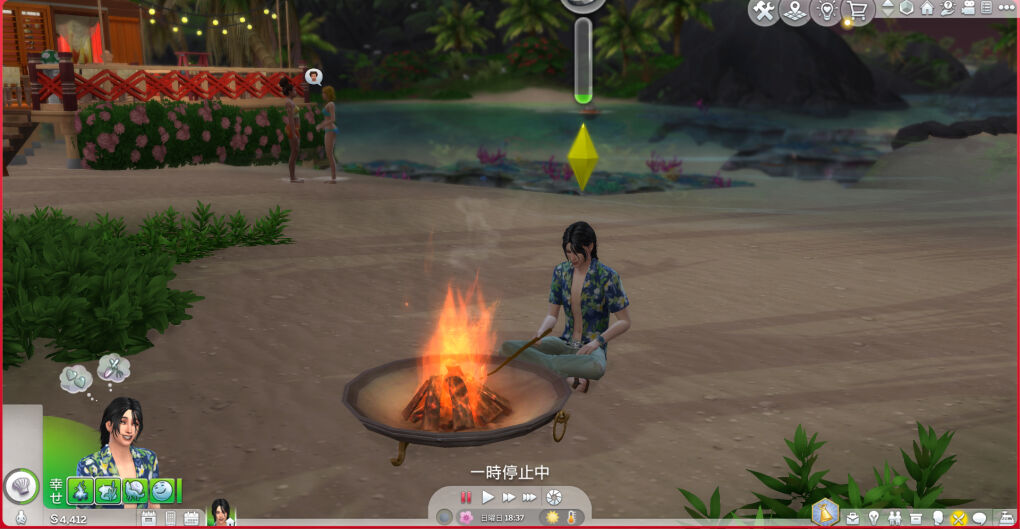なんか勝手にスルーしてくれるものだと思いこんでましたwてか、見えてるんだ!周りのシムに。浜辺で火を焚いてるの…w