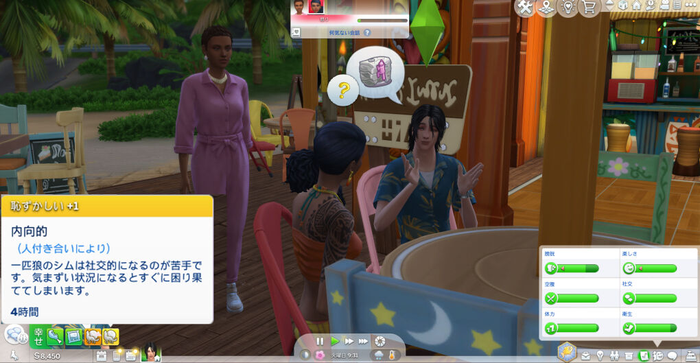 こちら、おそらく「ビーチライフ」願望にしたまま特質パネルのシムの作成で服装変更してたので、その関係で付いちゃった気がします。これ、こんなバグ?仕様?があるんですねえ。今まで追加特質なんて、特に気にせず遊んでたので全然気づきませんでした。