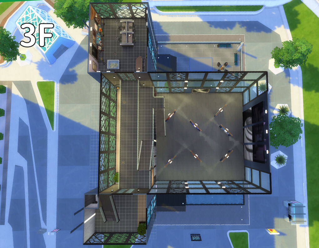 新くんやセオくんが大学生だったころ、よくここに来てレポートや課題をやっていました。三階まで来て話しかけてくるシムはなかなかいなかったので、勉強が捗って結構いいんですよねえ。ライトの近くにミニミニ禅テーブルをめり込ませているので、集中ムードに切り替えたい時利用してください。