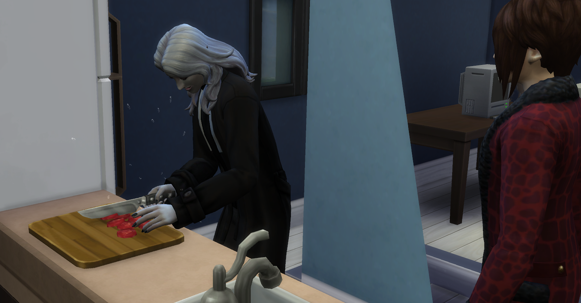 お二人とも全然ご近所さんではないけどwとりあえずご招待しています。イースは楽しそうにおしゃべりしていますが、「渇き」のバーがじわじわ減ってきており、筆者はだんだん焦ってきています。渇きってどうやって癒すんです?