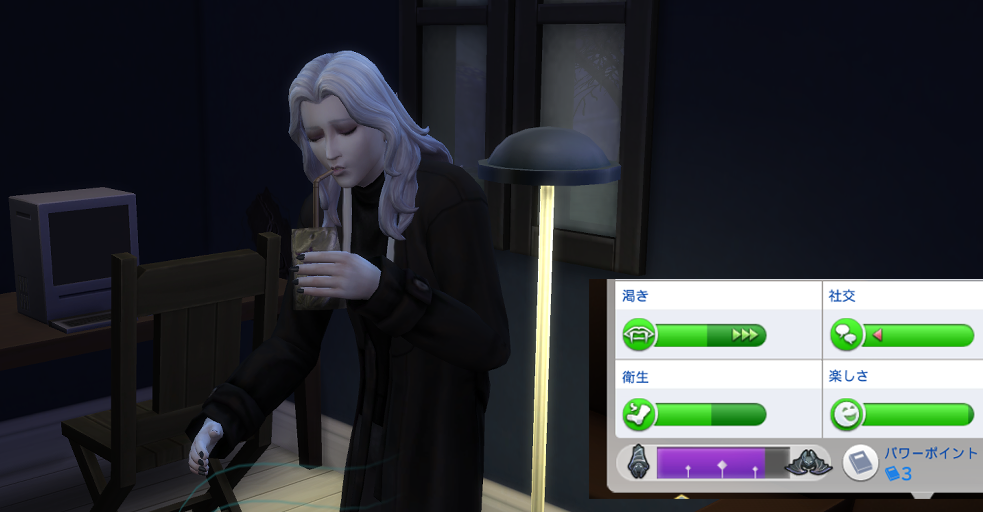 この時は気付かなかったのですが、シムって自律でドリンクをバンバン飲んで勝手に太ったりするんですが、イースは自宅だと全然ドリンクを飲まないんですよねえ。こういうところも結構アンデッドっぽいなーって思いました。