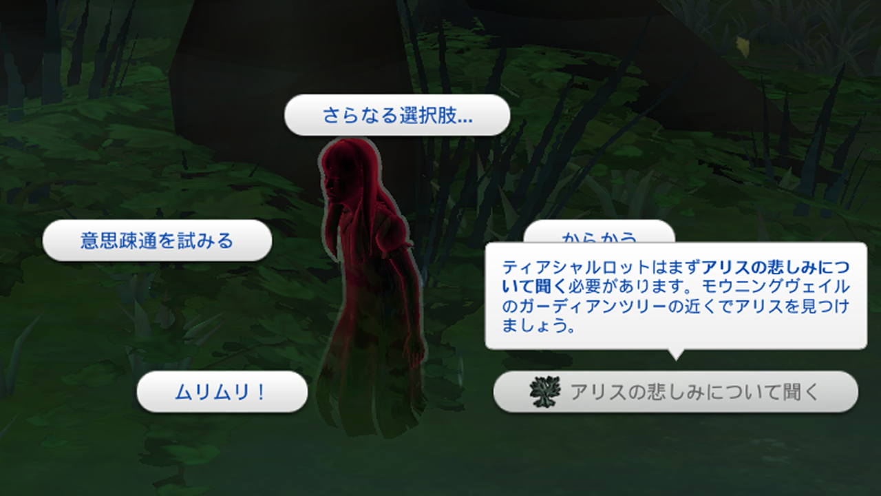 クリックすると色々選択肢が出てました。「アリスの悲しみについて聞く」というのがあるので、この子はアリスさんのお子さんの一人ですかね?