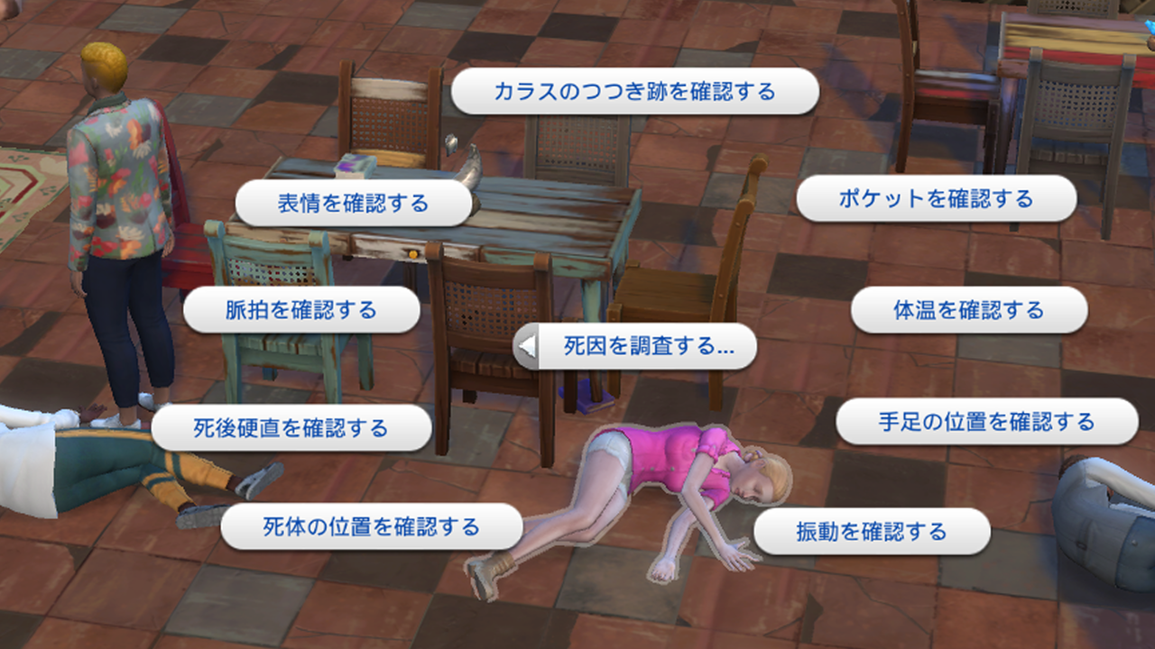 タスクは「死因を調べる」となってます。死体役の俳優さんたちをクリックで色々調べられました。