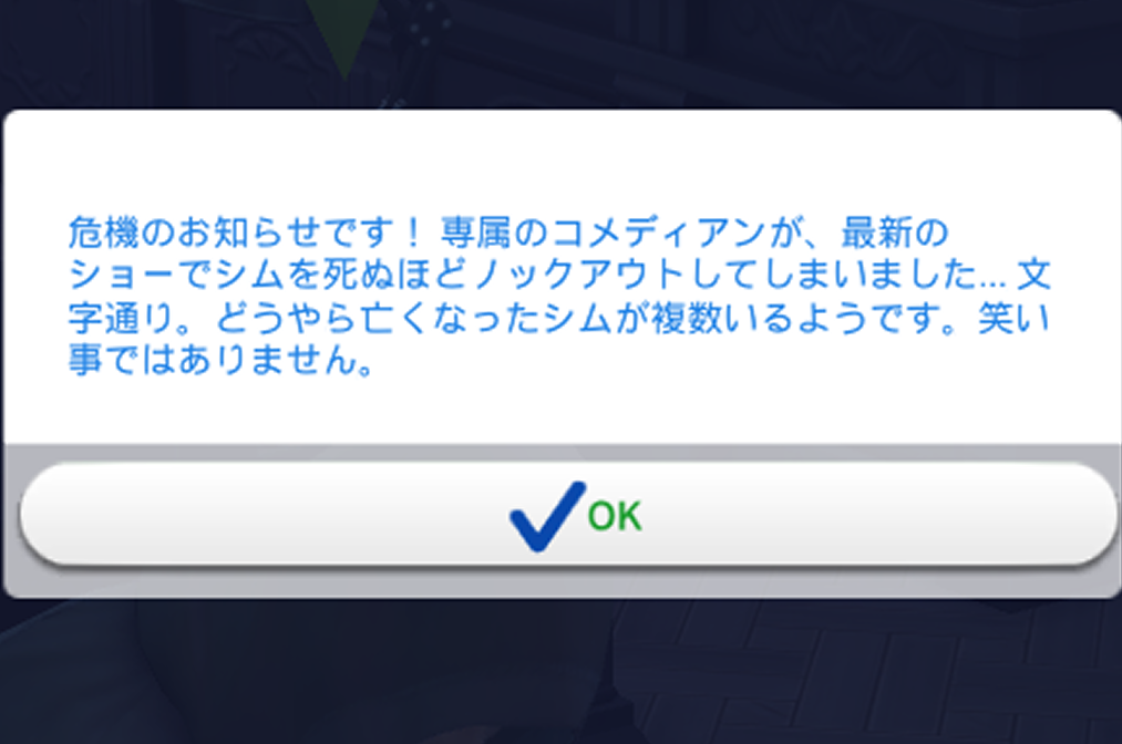 危機のお知らせです!専属のコメディアンが、最新のショーでシムを死ぬほどノックアウトしてしまいました…どうやら亡くなったシムが複数いるようです。笑い事ではありません。