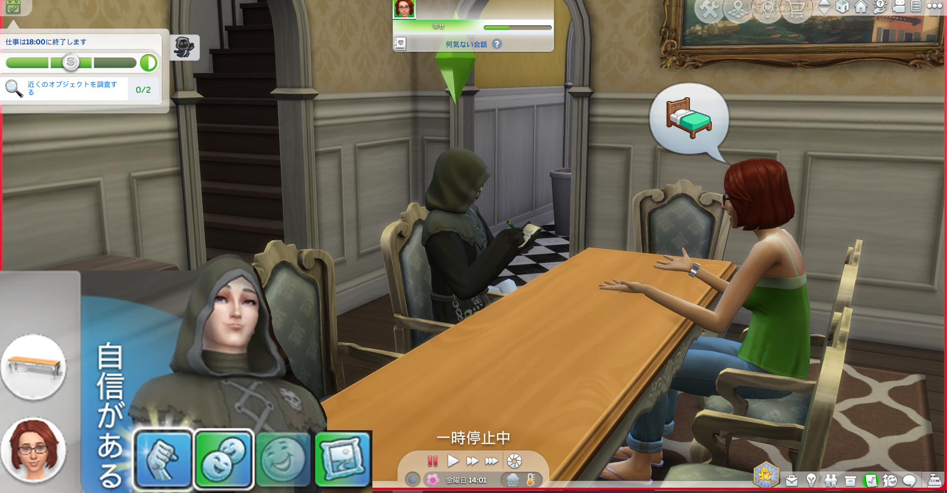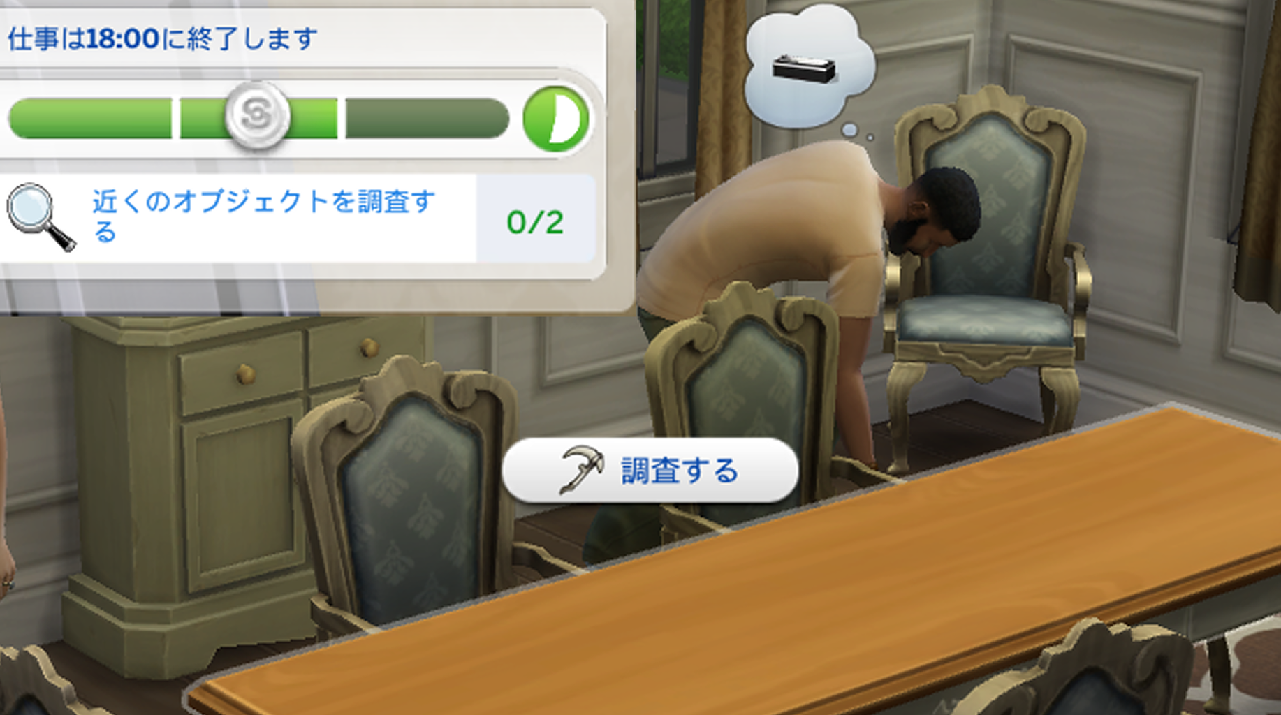 近くの椅子や机などをクリックすると「調査する」のコマンドが出てました。