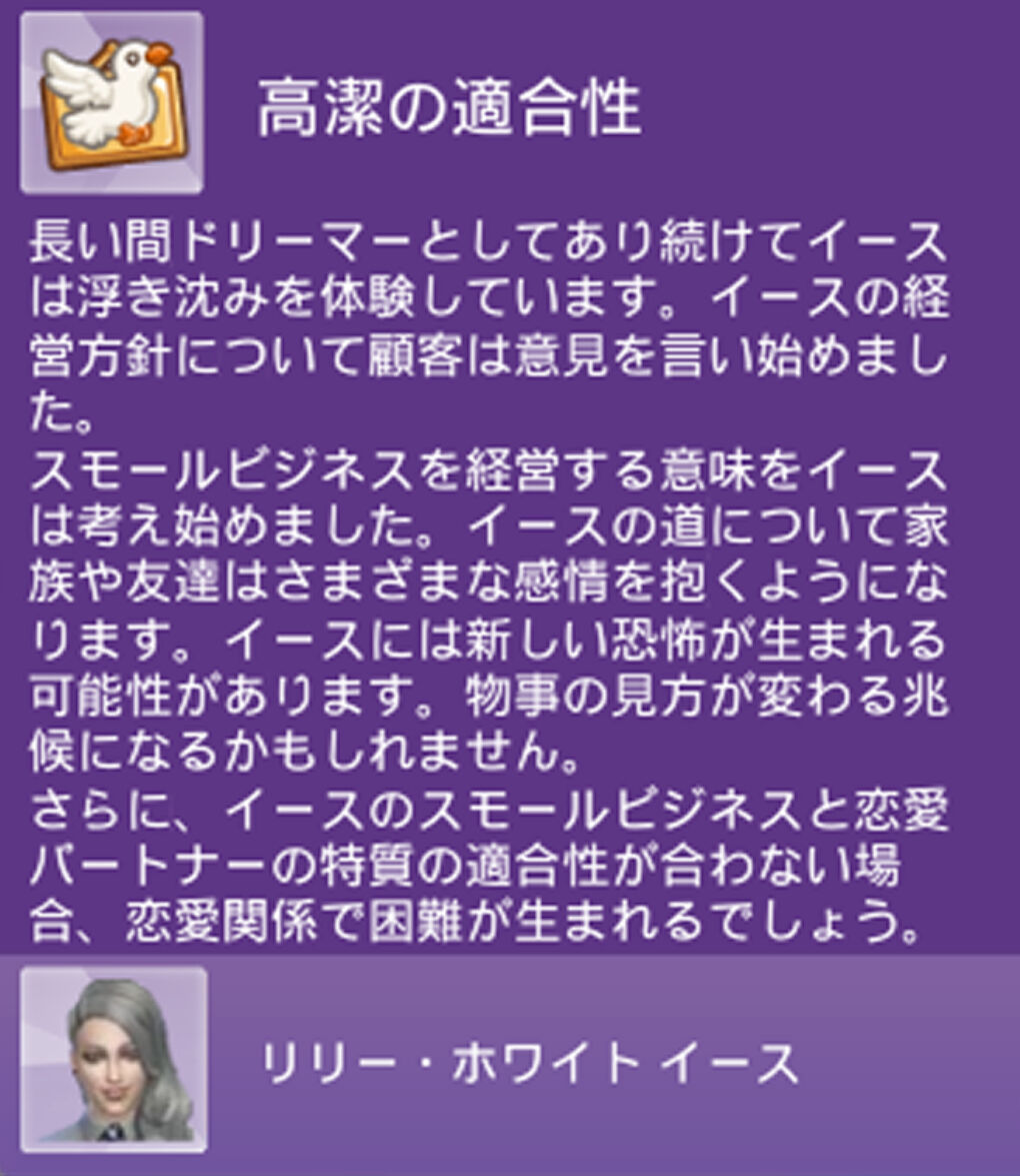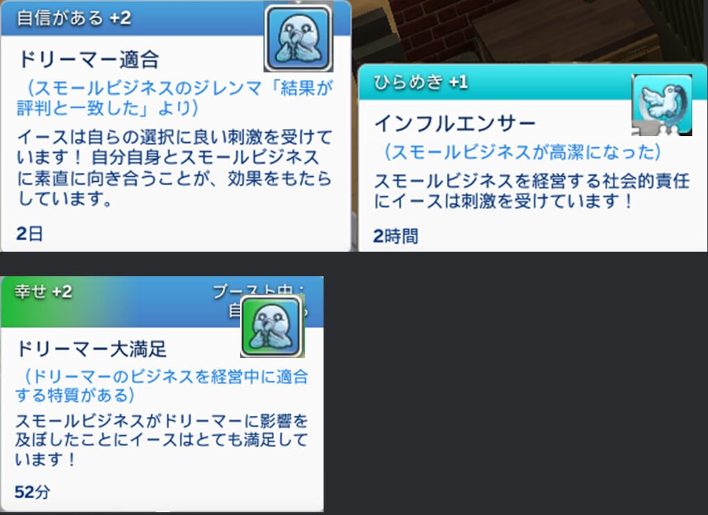 ふとマシェを見てみると、なんかかわいいムード取ってました。「誇らしげなサポーター」ですって~!「高潔」になると周りのシムにも影響があるんですねぇ。これだと「スキーマー」になっても色々ありそうでおもしろそうだな~w